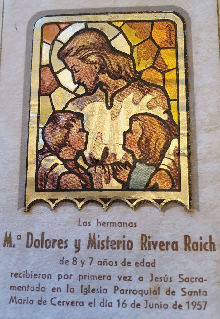 Moltes vegades quan hi havia dues germanes, la petita portava el vestit de la gran. No va ser el cas de la Dolors i la Misteri Rivera Raich ja que van fer la Primera Comunió juntes. Sembla que anaven ben iguales, fins i tot amb el pentinat.