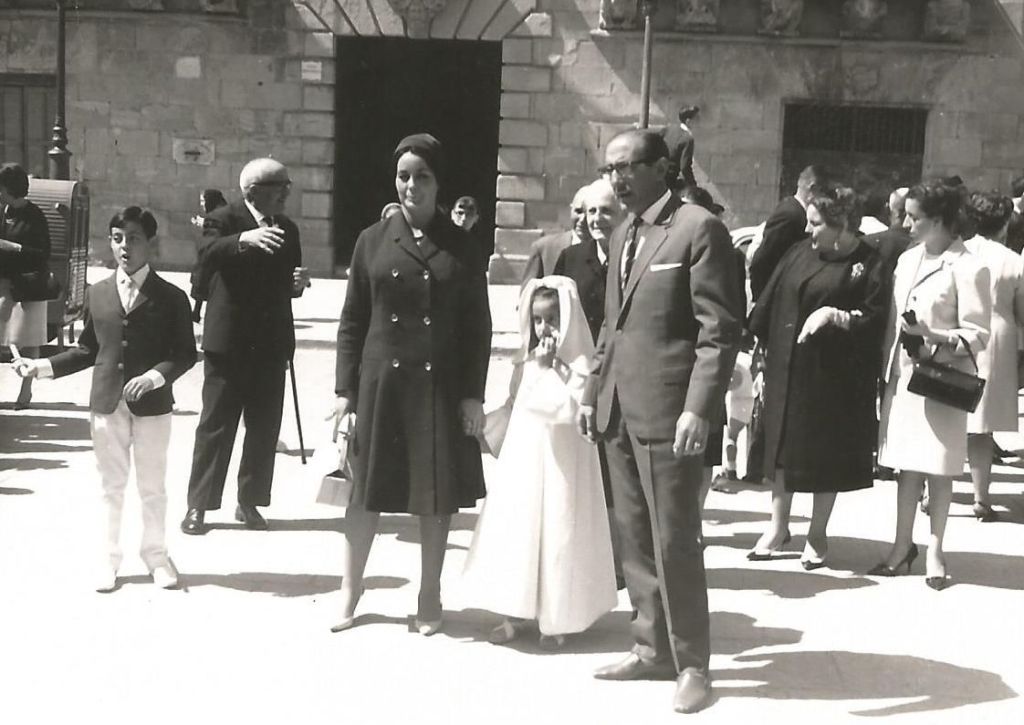 Més famílies a la plaça. Com podeu veure les imatges tenen molt encant perquè ningú està posant. El senyor Gasol i la seva esposa, Ramona, acomanyen la seva filla Montse que ha fet la Primera Comunió. A l’esquerra l’altre fill, l’Eduard ha heredat la bellesa de la seva mare. Una senyora guapíssima amb una bellesa més d’aquesta època que de la seva. Sempre anava diferent de l’altra gent. Mentre les senyores portaven pentinats elaborats ella, en aquest dia de festa, portava una mena de bandana al cap. Habitualment lluïa una melena llisa, fosca i llarga o bé una cua, en una època que les dones no anaven així.