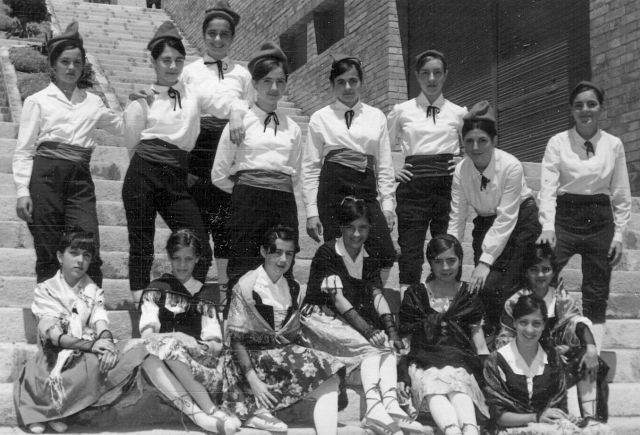 Dempeus, d’esquerra a dreta: Dolors Pujol, no identificada, Carme Fortuny, Galitó, Guillermina Puig, M. Teresa Font, Dolors Vergés i Angelina Vergés.