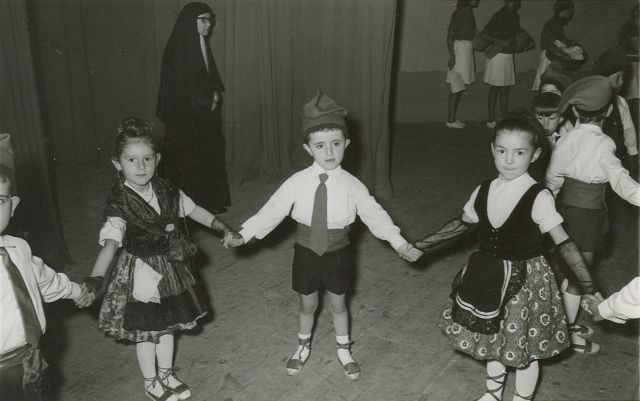 Ara són els més petits els que anaven amb el vestit tradicional. Aquest nen és Jaume Bonjoch. Si mireu la monja que es veu al darrere podreu veure com anaven vestides les religioses de la Sagrada família en aquella època.