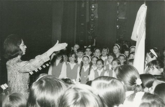 Però com heu pogut veure van ser moltes les vegades que les actuacions tenien lloc a l’escenari del Teatre del Casal. Aquí podeu veure un grup d’alumnes cantant. Les dirigeix una senyoreta que donava classe al col·legi i que tenia molts coneixements de música. Es deia Leocadia.