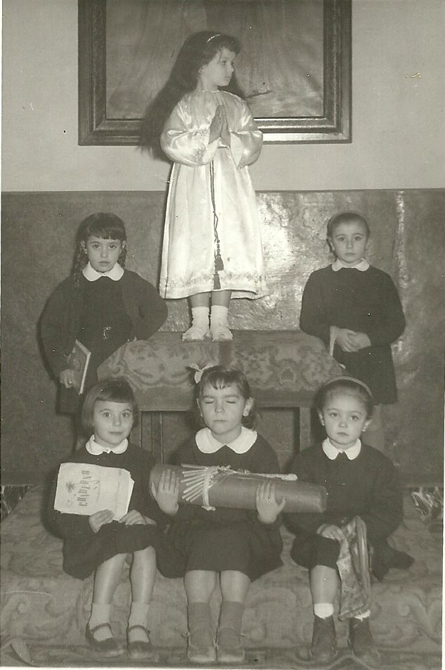 Les nenes assegudes són: Montse Xuclà, Pepita Xandri i una no identificada. La que fa de verge nena és Anna M. Tardà. A l’esquerra s’hi veu Rosita Segura i, a la dreta, M. Dolors Ibáñez.