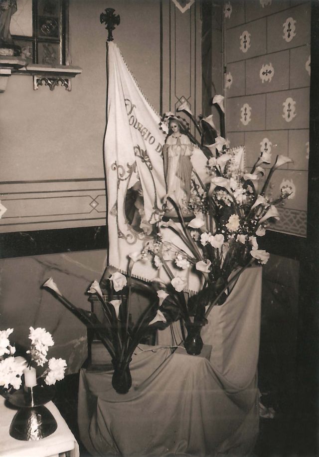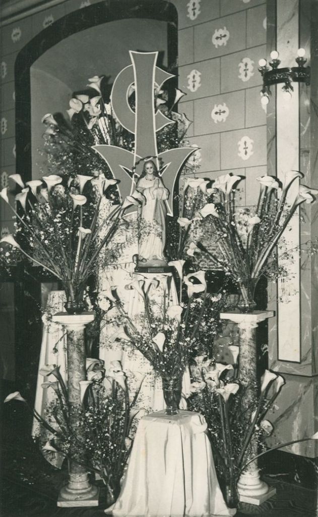 Una de les activitats que es celebrava amb més relleu a la capella era el “Mes de Maig” dedicat a la Verge Maria. Un símbol important del centre. Cada any es posava la figura a la banda dreta de l’altar i es decorava tan bé com es podia. En aquestes properes fotografies podeu veure el resultat de la posada en escena de diferents anys.