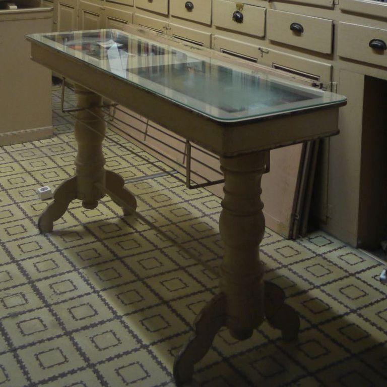 Aquesta taula, feta a mida, amb el vidre que deixava veure el que hi havia a sota és molt bonica. Un calaix feia possible treure les coses de dintre.