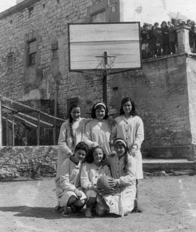 Al Col·legi de la Sagrada Família crec que l’únic esport que es practicava va ser el bàsquet. El pati de la dreta estava preparat per aquest esport i vam ser moltes les alumnes que ens hi vam posar.