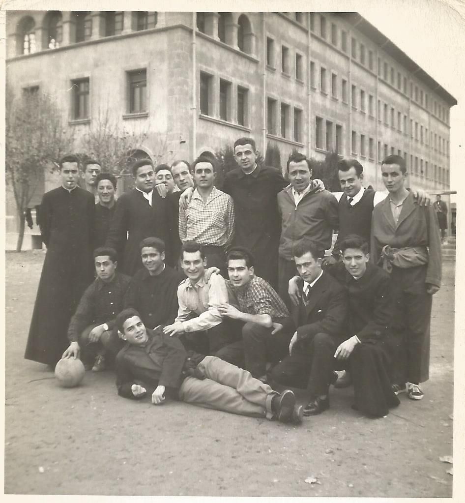 L’Ignasi amb una mirada de nen entremaliat és el que està el primer de mà esquerra agafant la pilota. Crida l’atenció que poguessin jugar amb aquestes sotanes que els hi arribaven fins els peus. Jo recordo haver-los vist amb Mn. Jaume Berenguer jugant al Portalet, a Cervera, amb aquestes peces que es posaven arramagades.