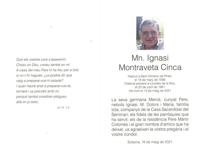 L’Ignasi ha mort als 83 anys i sembla mentida que hi hagi pogut arribar ja que durant tota la seva vida la salut l’ha tingut molt fràgil. Alguns companys seus de Seminari diuen que, de ben jove, passava molt temps a l’enfermeria. Aquests mals tràngols han estat una constant a la seva vida.