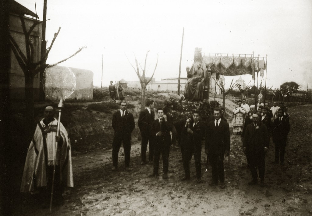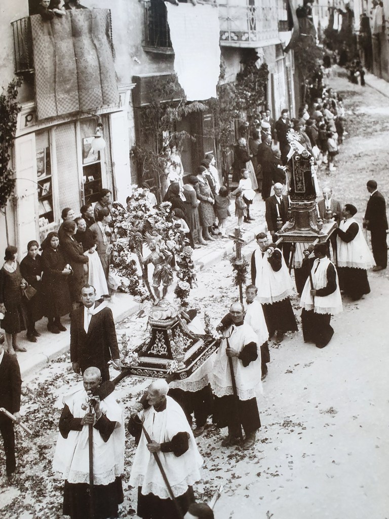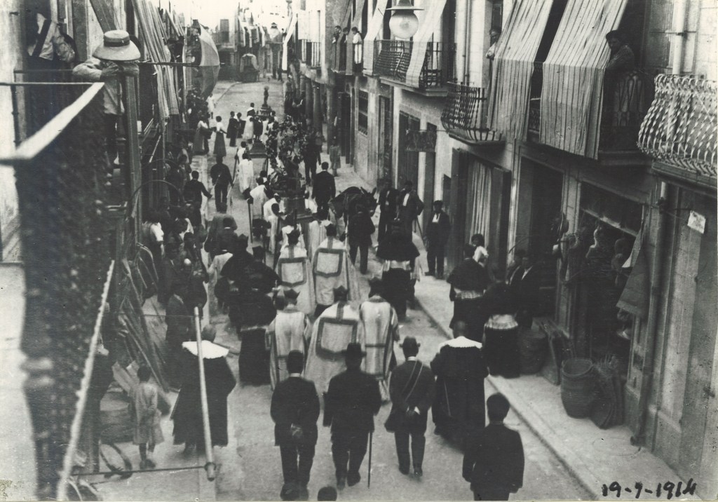 Aquesta altra, que passa pel carrer Major, s’hi veuen les imatges de l’anterior encapçalant la processó. Es tracta de la processó dedicada als Sants votats. També es feia un ofici solemne. La notícia va sortir publicada amb aquest text: “El domingo último se celebró la tradicional fiesta dels Sants votats con procesión y solemne oficio. El orador encargado de la oración sagrada se lamentó de que una fiesta popular, haya quedado aducida a la más infíma expresión de su voto”. Sembla doncs que la cosa anava de baixa.