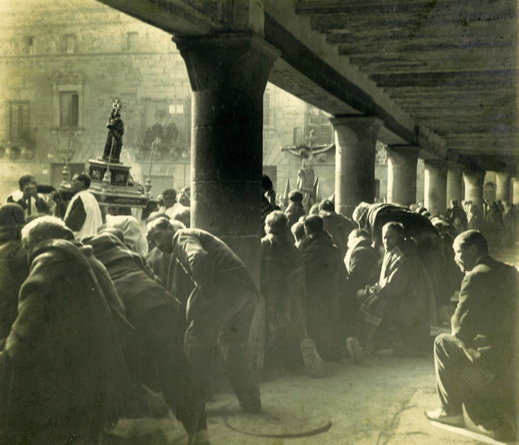 Aquesta fotografia molt coneguda està feta en el moment de passar la processó per la plaça Major.
