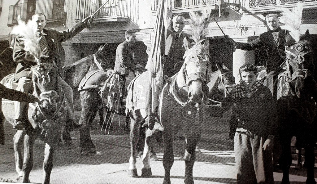 Aquesta fotografia és la número 585 de la Història Gràfica de Cervera. Correspon a la processó dels Tres Tombs que es feia durant la festivitat de Sant Antoni Abad, patró dels animals. Es celebra el dia 17 de febrer dins la setmana coneguda com dels “barbuts”. Al centre de la imatge s’hi pot veure el banderer i al costat els cordonistes que l’acompanyaven.