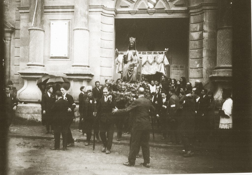 El dia 3 de maig de 1926 la processó surt de l’edifici de la Universitat sent la primera vegada que aquesta imatge sortia en processó pels carres de Cervera. Va ser en motiu de la proclamació oficial de madona Santa Maria com a patrona dels exercicis parroquials durant la IV Assemblea de Lligues Parroquials de Perseverança de tot Catalunya. La Lliga Parroquial de Perseverança fou fundada a Cervera el febrer de 1923 pel jesuïta Francesc de Paula Vallet.