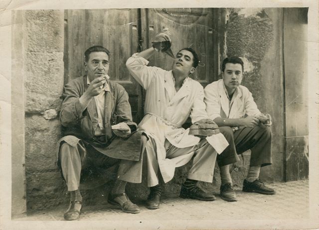 En aquesta altra fotografia, d’un berenar compartit, Martí Rosell, ja de més edat, (fixeu-vos en les curioses sandàlies que porta, com de nen) està acompanyat de dos joves ben coneguts. El del mig és Ramon Dardé, fill del propietari de la barberia de “cal Jordi”, que estava a l’extrem del carrer Combat. Resulta ben curiós que en ple carrer el porró de vi hi tingui un protagonisme. Això sí que eren uns altres temps!. Martí va vestit amb la roba de treball. Porta una peça coneguda com “guardapolvo”. Un jove Eusebi Ortiz els acompanya. Treballava a la barberia i va vestit igual que el seu company: un “guardapolvo”, en aquest cas de color blanc, per l’ofici que feien.