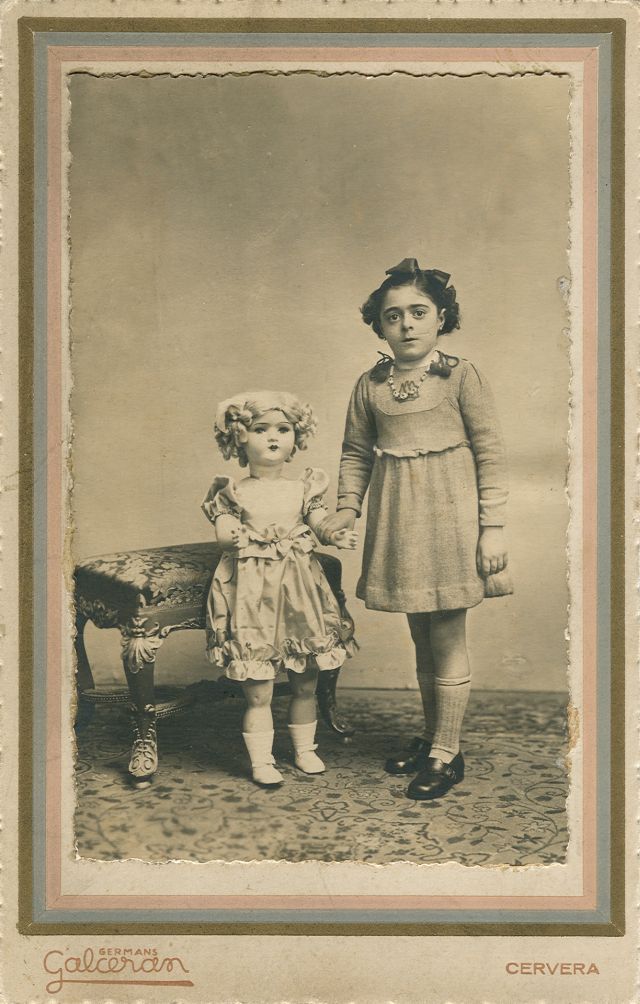 Aquesta fotografia que té una bona pila d’anys està feta a l’estudi fotogràfic del carrer Major dels germans Galceran. La Lola està acompanyada d’una supernina, poc freqüent en aquell època. En temps de festes nadalenques venien joguines, per tant la millor de la casa per ella.