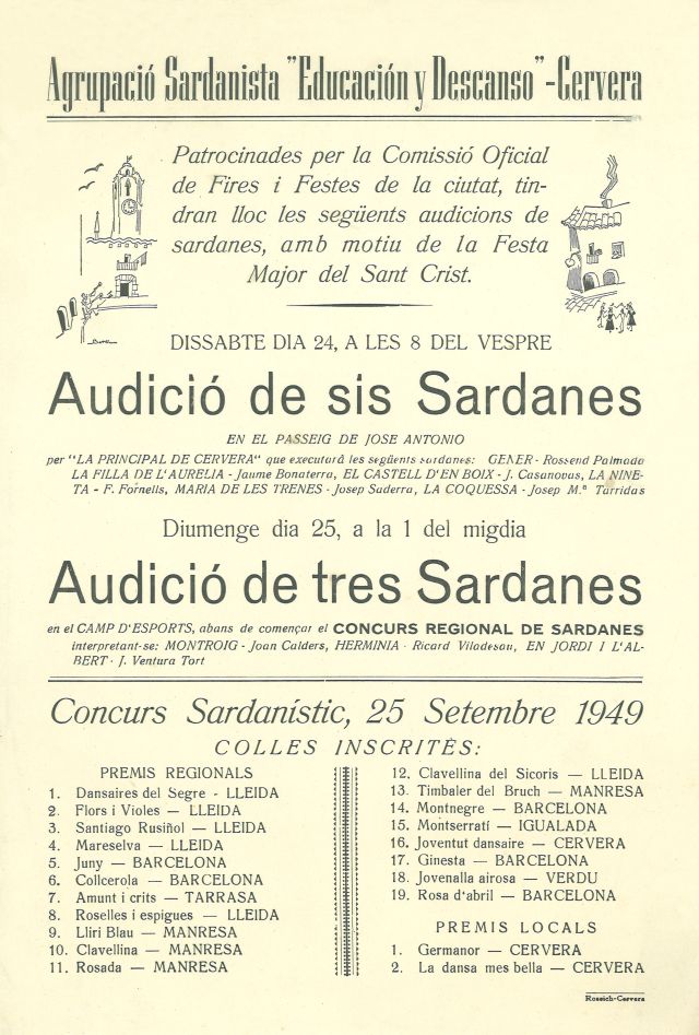 Es té constància que a Cervera, d’una manera puntual, s’havien organitzat concursos de sardanes, tant locals com provincials, de colles lliures. Aquests concursos van tenir lloc a la plaça Major, als patis de la Universitat i, al setembre de 1948, a l’antic envelat que cobria tota la plaça Santa Anna, on el Casal hi quedava integrat.