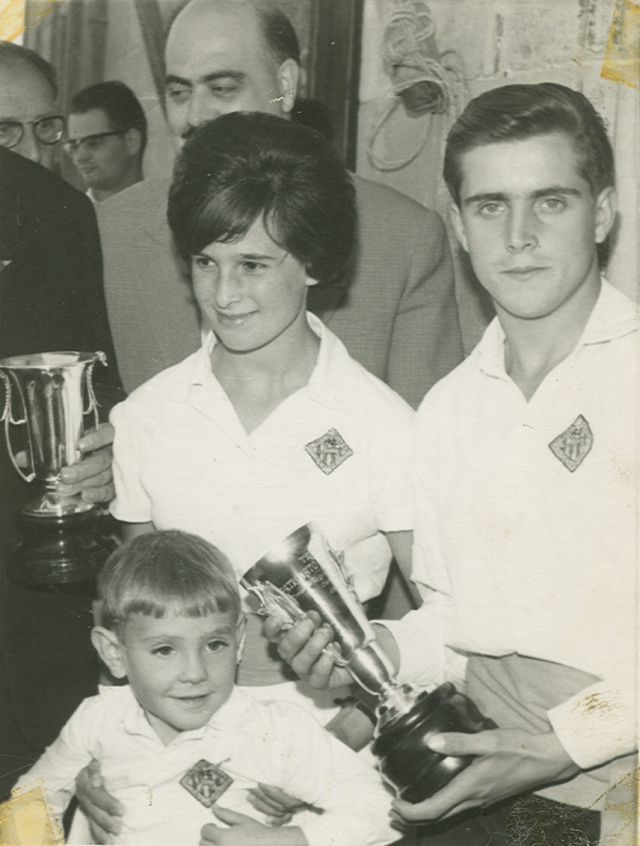 Era important per la colla assolir un bon lloc a la classifiació i anar obtenint trofeus. Els germans Antonieta i Jaume Miret mostren els trofeus guanyats. Els acompanay el nen Lluís Tosal. Fotografia datada l’any 1963.