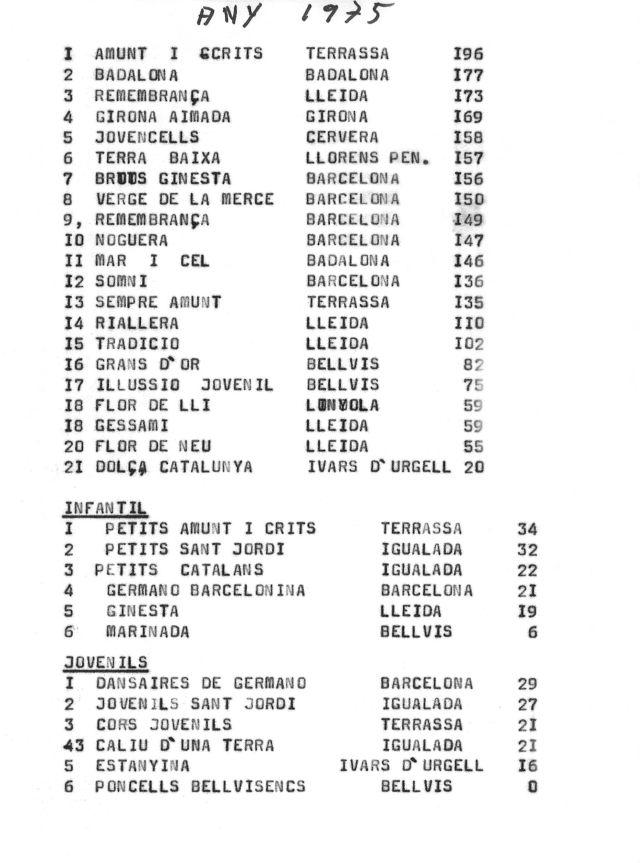 Aquest és el llistat de classificació de les colles del concurs de sardanes de l’any 1975. Amunt i Crits era una colla molt bona que guanyava sovint. La colla de Cervera Jovencells va quedar en cinquè lloc.
