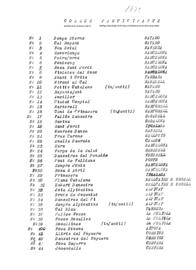 El llistat de colles d’aquest mateix any. El número 8 el porta Violetes del Bosc que era una colla fantàstica. Possiblement va guanyar el concurs.