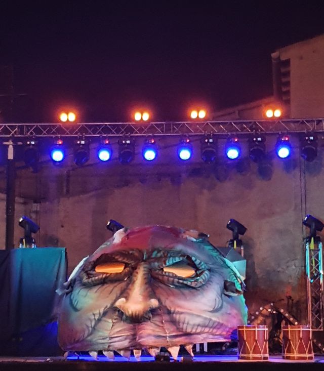 L’escenari el presidia aquesta imatge, amb una boca gegantina, que és d’on anaven sortint tots els personatges. És la que s’ha fet servir per la Passió Medieval i que simbolitza l’infern.