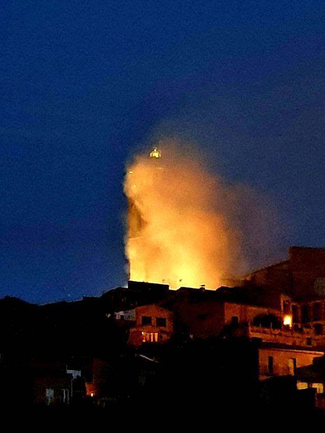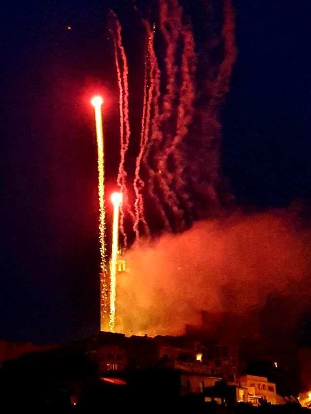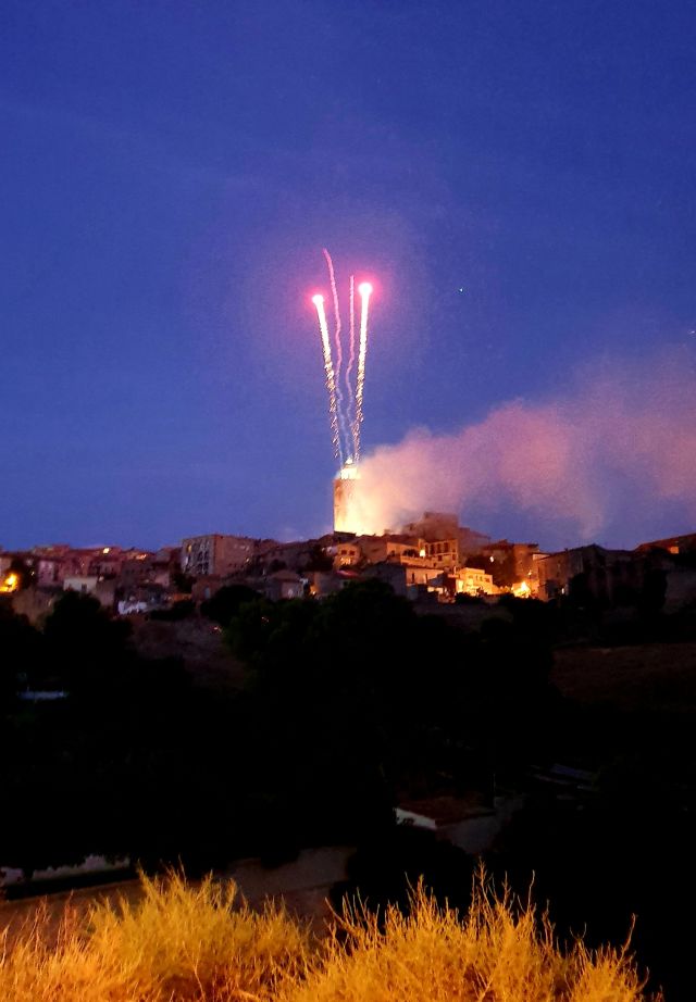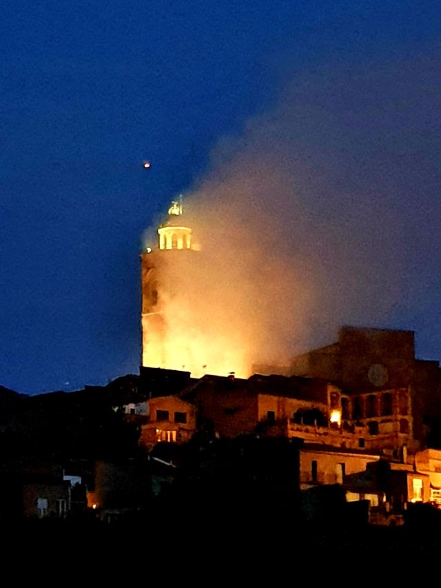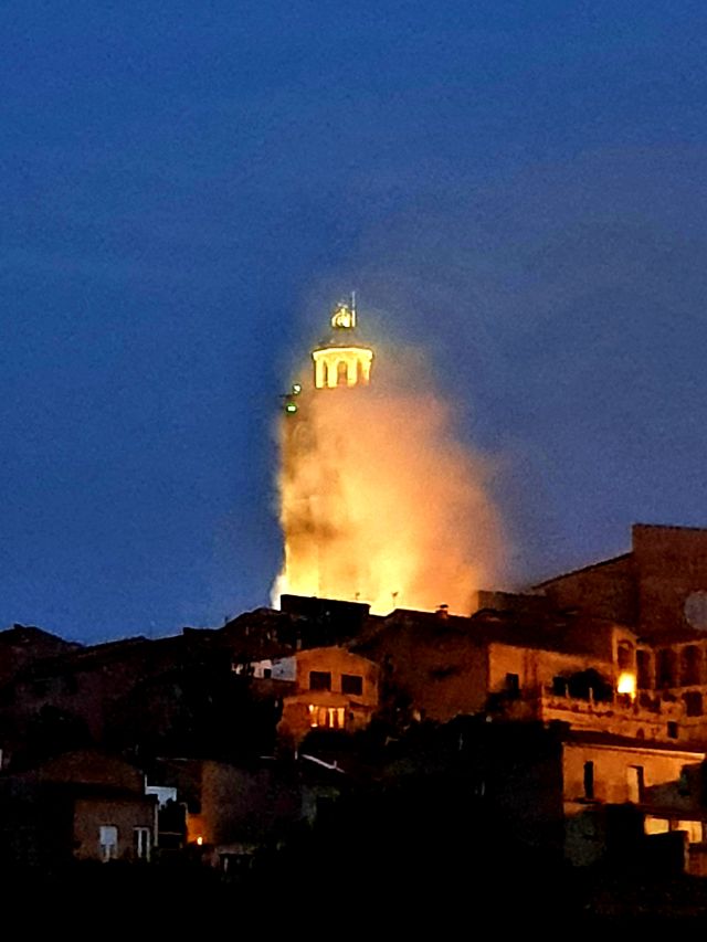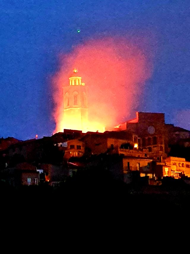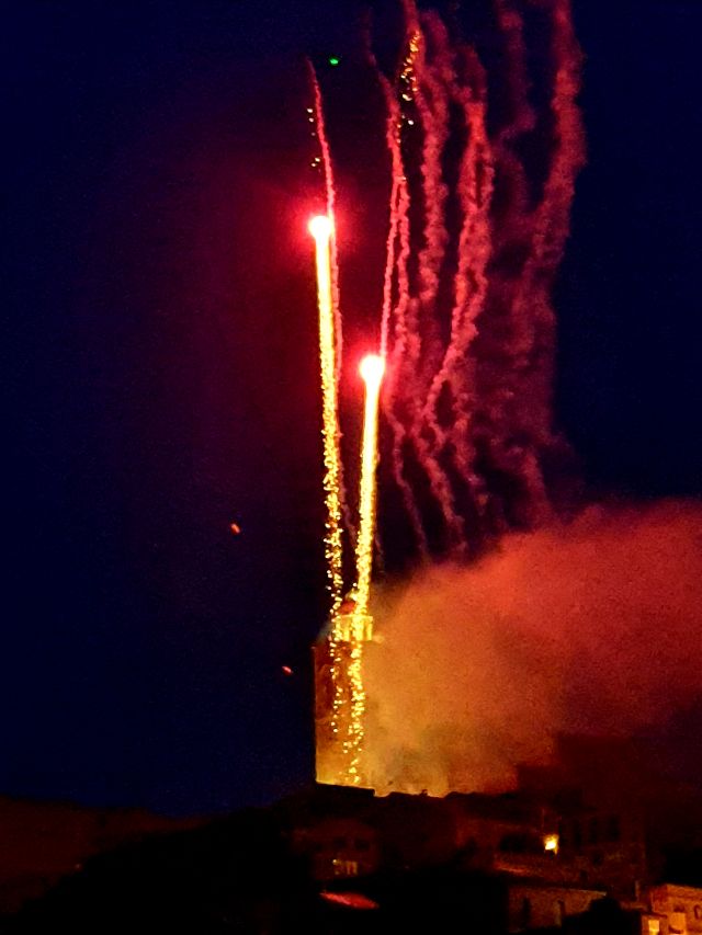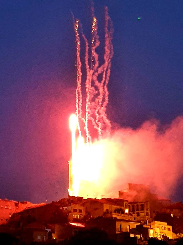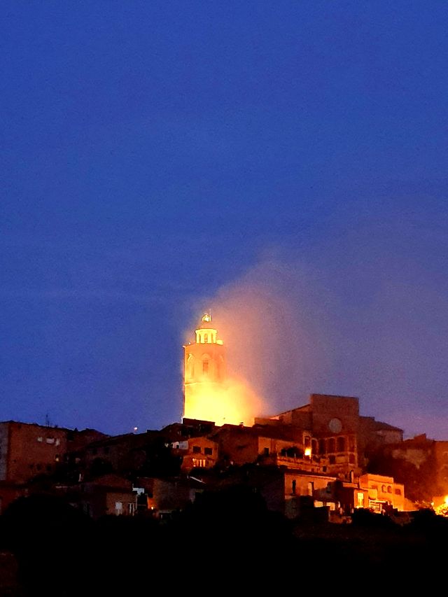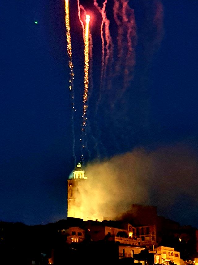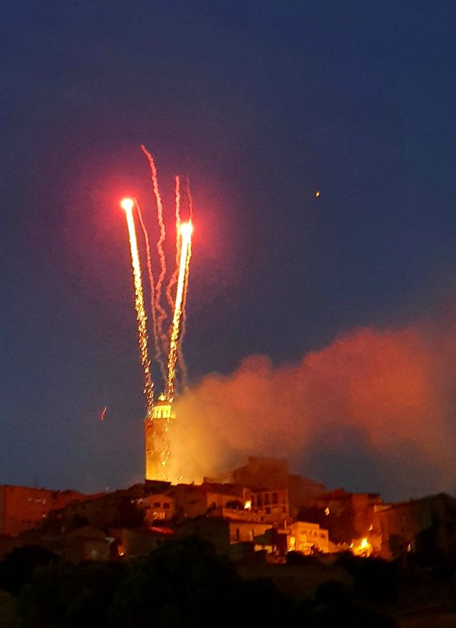 L’any passat no es va poder fer però enguany s’ha pogut tornar a celebrar. Com que tenia entrada per anar al concert dels Pets ja no vaig anar-hi perquè es cavalcaven els horaris. Casualment em vaig deixar una cosa a casa i la vaig anar a buscar de pressa. Va ser aleshores quan, des del carrer Granyena vaig veure com les bengales pujaven campanar amunt tornant el cel vermell.