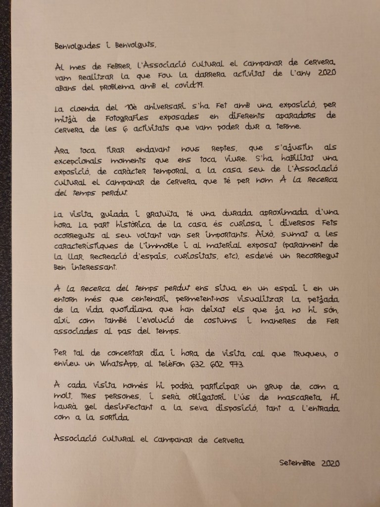 L’Associació Cultural el Campanar va decidir que, tot i la pandèmia i, sempre prenent totes les mesures de seguretat, que seguiria programant activitats. Després d’un treball importantant va enllestir la recerca de dades històriques i la museització d’un immoble més que centenari situat al carrer Combat, 24, que és la seu de dita associació.