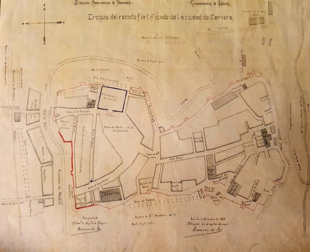 Cal explicar que abans del dia de l’atac a Cervera i, allotjats a la Universitat, hi havia els regiments de Burgos i de Soria que van ser enviats des de Madrid pel govern lliberal per defensar la ciutat dels carlins. Tement que el campanar de Sant Antoni, que era alt i esvelt, podria ser un punt perillós si entrava l’enemic, per la seva proximitat a la Universitat, el van enderrocar. Avui es veu perfectament com puja des del carrer i queda estroncar al capdemunt.