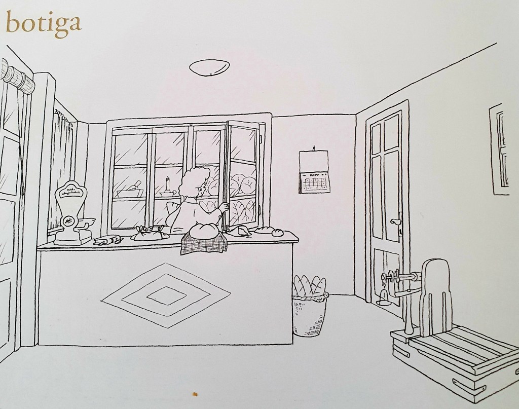 Aquest és l’únic dels dibuixos que no va fer el Ton Granell. L’autora és Vanesa Carcasona Bonet i reflexa perfectament com era la part de la façana de la casa del carrer Combat, 24 que corresponia a la botiga.