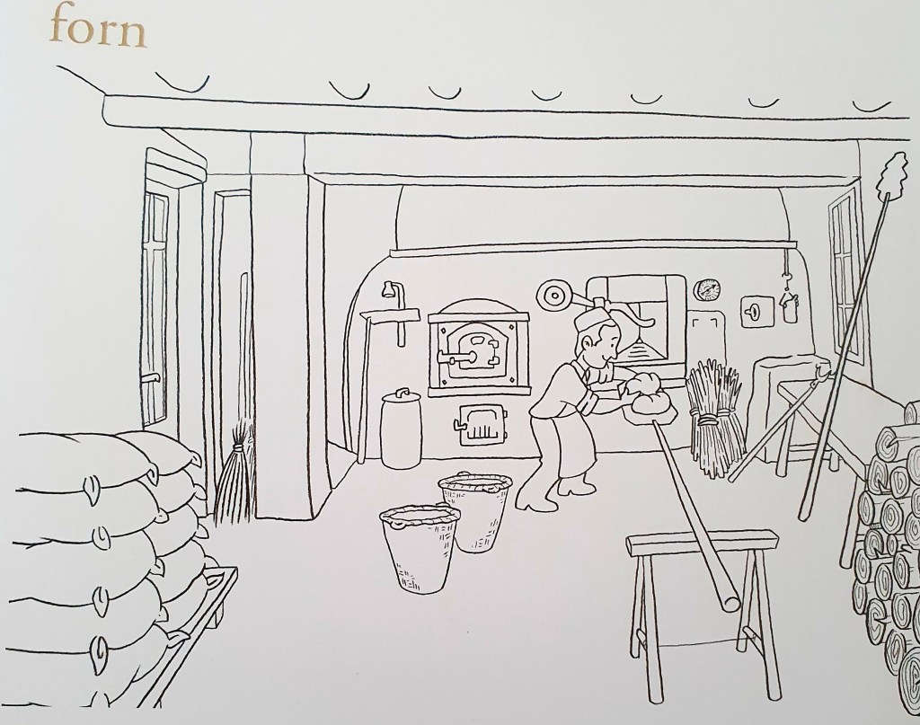 A l’espai dedicat al forn s’hi accedia directament des del carrer. A la paret del davant s’hi veia la tampa, a la dreta, que és la porta de ferro per on s’enfornava, l’escopeta, a l’esquerra, que és per on es posava la llenya per escalfar el forn i, la porteta de sota, que servia per retirar les cendres Estan bastant ben conservades dintre del que cap…