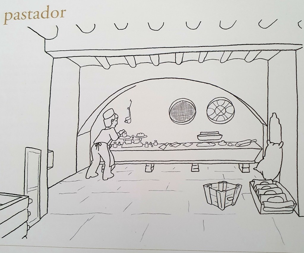 El “pastador” queda emmarcat amb unes parets de pedra. A la del fons hi ha una arcada molt elegant. Sota aquest arc hi havia una pastera llarguíssima que, en retirar-la, es va haver de partir en dues degut a que no es podia traslladar amb comoditat. Tots els elements que formen part de l’ofici de forner es conserven. De fet, a la Cafeteria, es disposa d’un catàleg amb el que es pot fer un recorregut tot i llegint les explicacions i visualitzant tots els estris. Caldrà, en acabar aquesta sèrie de posts, fer-ne alguns informant de tot aquest material que és ben interessant.