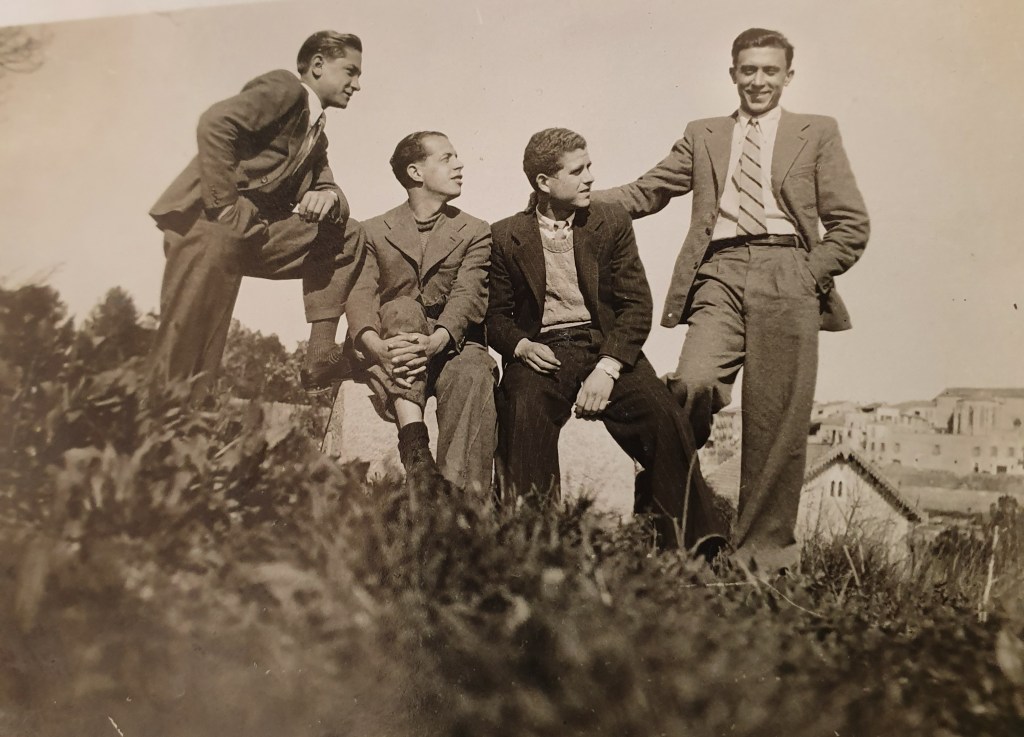 El pare, Francesc Bonet Estela és el que s’agafa la cama amb les mans. A la dreta i, mirant a l’objectiu, s’hi veu Francesc “Paquitet” Vidal, que vivia davant la casa del carrer Combat, a “cal Clavetaire” i era un dels que sovintejava les trobades al forn. El meu pare i ell eren molt amics: els hi deien: el “Paquito” i el “Paquitet”. Suposo que per l’edat ja que el pare era una mica més gran. Els altres dos joves que els acompanyen no estan identificats.