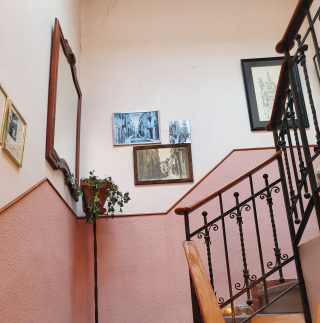 L’escala llueix una barana de ferro forjat amb un passamà de fusta. Sempre havia sentit explicar que la van fer al taller que hi havia davant de casa conegut com “cal Clavetaire”. Un dels fills es deia Pepe, que més tard va muntar una botiga de vidres a la Costa dels Campos. L’altre fill, el petit, era el Francesc o “Paquitet”, molt amic del meu pare. El cognom de la família era Vidal. És una barana molt treballada, bonica, però complicada a l’hora de la neteja.