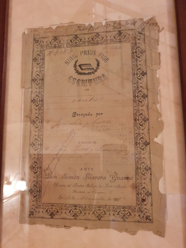 Queda per tancat aquest post amb la imatge, emmarcada, perquè ja començava a deteriorar-se, de l’escriptura original de la casa. S’hi pot llegir que es va fer a la notaria de Don Simón Clavera Guarné i el comprador va ser el meu besavi, Don Delfin Bonet Fusimany. A baix a la dreta s’hi llegeix la data, “14 de noviembre de 1911”.