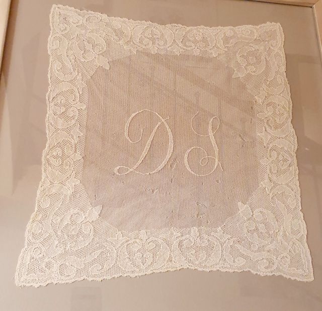 Encetem doncs el recorregut per l’escala. La primera cosa que s’hi veu és aquest quadre que emmarca un tapete de tela de mantellina brodada que porta les inicials de D S. És la peça de roba blanca més antiga de la casa, feta a finals del segle XIX, per la meva besàvia Dolors Sobrevila Coromines. Tot i que ella no va trepitjar mai aquest habitatge perquè ja era morta quan el seu marit el va comprar, sí que hi van traslladar aquí moltes de les seves coses.