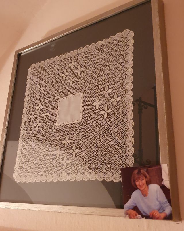 Al damunt d’aquest tapete brodat de la besàvia, com podeu veure en la fotografia anterior, s’hi mostra la peça de roba blanca més actual. És un mocador amb una preciosa punta feta amb boixets obra de la meva estimada cosina segona, Tresa Carcasona Boquet, que ja fa uns anys que ens va deixar. Me’l va regalar quan encara no sabíem que se n’aniria tan d’hora. El record de la seva imatge acompanya aquesta delicat treball.
