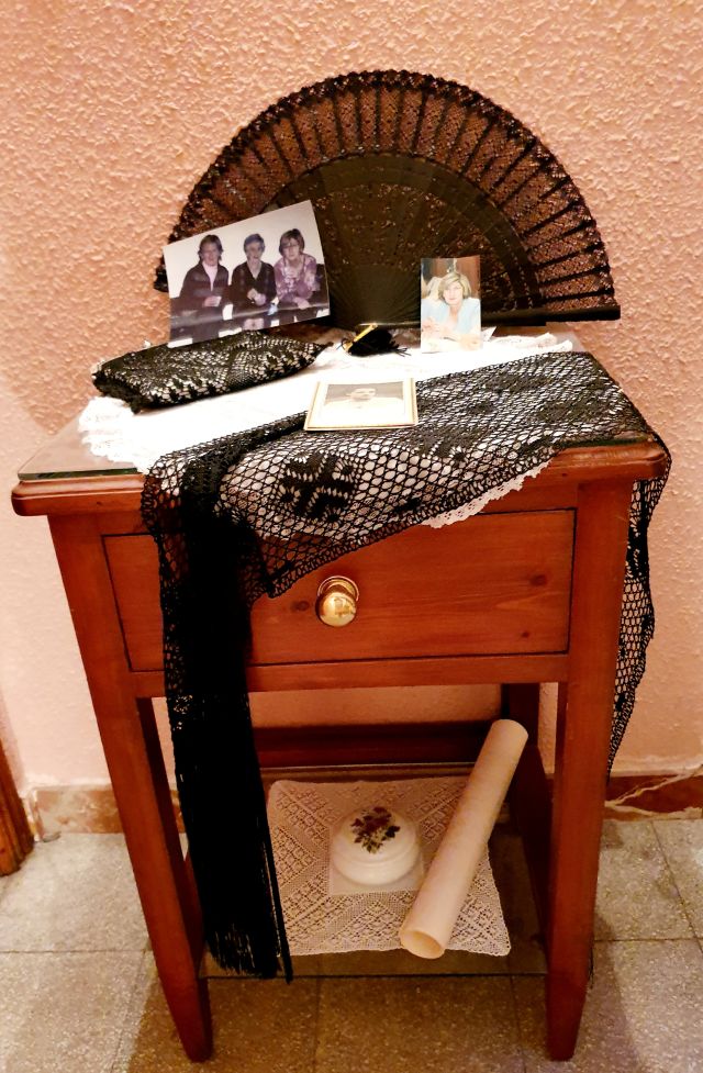 Al primer replà de la casa ens trobem amb un moblet que fa de suport a unes fotografies i a un bolso, un ventall i un bufanda de feata fets amb punta de coixí i fil negre. Després que aquesta casa hagués tingut dones excepcionalment dotades per cosir de blanc aquí es mostren les imatges de les que van heredar aquest art. De la generació que ara serien centenàries ho van ser les cosines germanes Ramona Bonet Estela…