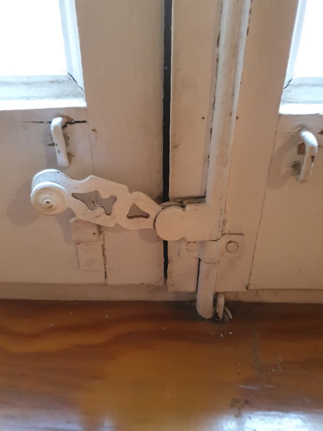 Moltes de les finestres de la casa encara es tanquen i s’obren amb uns ferros que deu fer molts anys que hi són. A més tenen finestrons també equipats amb uns mecanismes de ferro que fan que quedin fortament tancats. A la part de fóra hi ha persianes que pugen i baixen amb una corda que les subjecta. Ho podeu veure en aquesta imatge.