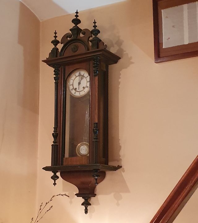 El rellotge, que deu ser dels anys quaranta, durant molts anys va estar a la paret del menjador marcant el pas del temps. Sempre que es parla dels espais en que es va viure es fa referència al primer pis que va ser l’habitatge familiar.