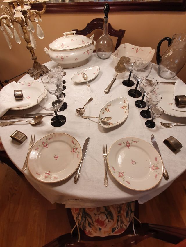 La casa disposa d’una gran quantitat de jocs de llit molt ben treballats i sembla que, de jocs de taula, tampoc no enfaltaven. Sempre he sentit explicar que, durant la guerra, van entrar soldats i els jocs de taula van marxar amb ells. Per tant tot i que la taula està parada amb l’antiga vaixella el joc de taula és senzill, de diari. Com podeu veure porta les inicials de la jove Josefa/Pepeta Bonet Sobrevila que va morir molt jove del tifus.