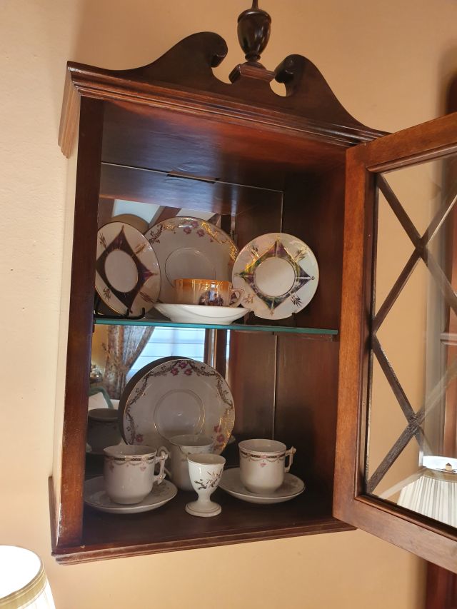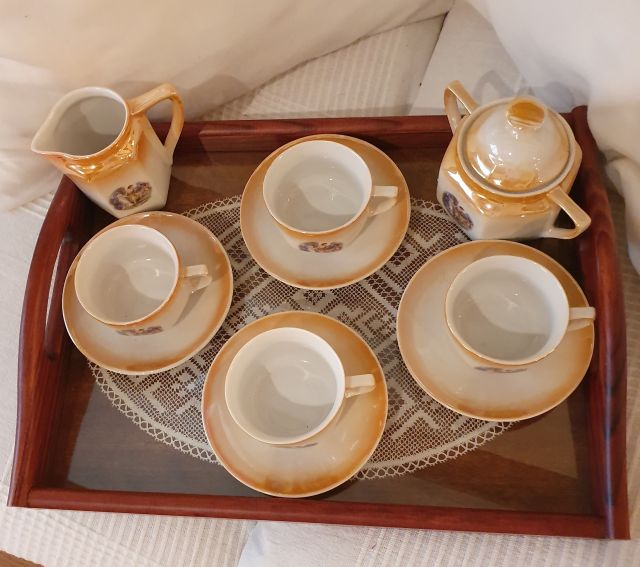 Un joc de cafè de porcellana que compta amb 12 peces. Aquest disseny era ben corrent a finals del segle XIX. El tapete, molt difícil de fer, perquè per donar el tomb es necessita posar-hi una quantitat molt elevada de boixets. És obra de M. Carme Carcasona Bonet, la darrera cosidora i brodadora de blanc de la família.