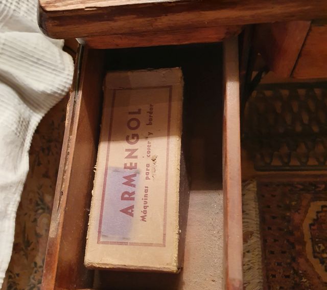 A dins el calaix encara s’hi pot veure una capseta amb canilles i altres coses de ca l'”Armengol” l’establiment que venia màquines de cosir i tenia cura d’arreglar-les quan s’espatllaven.