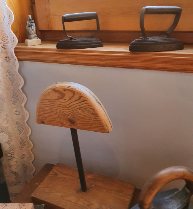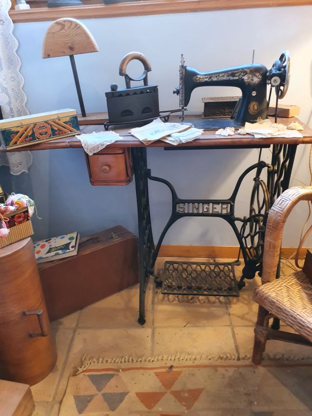 La màquina de cosir, de la famosa casa Singer, està en perfectes condicions. Una antiga planxa de ferro, de les que s’omplien amb carbó, ens informa de com es planxava més de cent anys enrere.