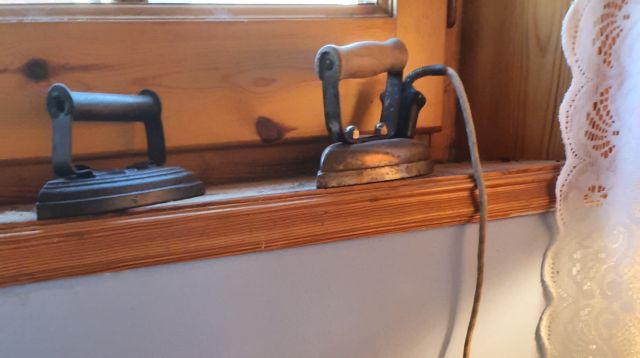 Un parell de planxes, ja una mica més modernes. La de l’esquerra, de ferro, s’agafava amb una roba dobla per no cremar-se qui la feia servir. s’escalfava a damunt o al costat de les estufes. La de la dreta és de les primeres que funcionaven amb electricitat.