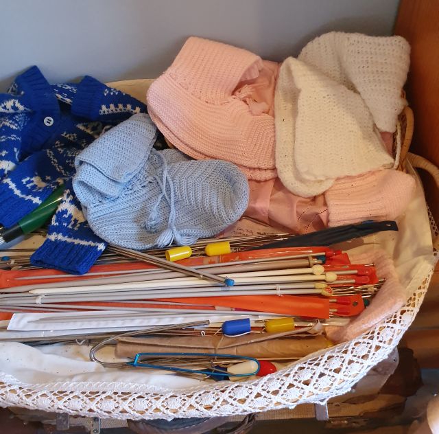 Peücs i un jersei de jacquard fets amb agulles de fer mitja. Per protegir-les s’hi posaven uns taps als extrems que anven agafats amb una goma perquè s’aguantessin bé.