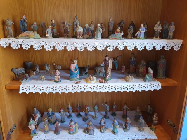 Totes les altres figures són molt antigues i han estat trobades en fires de brocanters, Les del prestatge inferior porten un record que espanta una mica ja que es van comprar el dia 23 de febrer de 2021 a la Fira que es fa cada quart diumenge de mes a Igualada. Sembla que en aquesta data el covid ja corria per aquesta ciutat. El 13 de març ja es van tancar el col·legis. espanta pensar el perill que es va córrer…