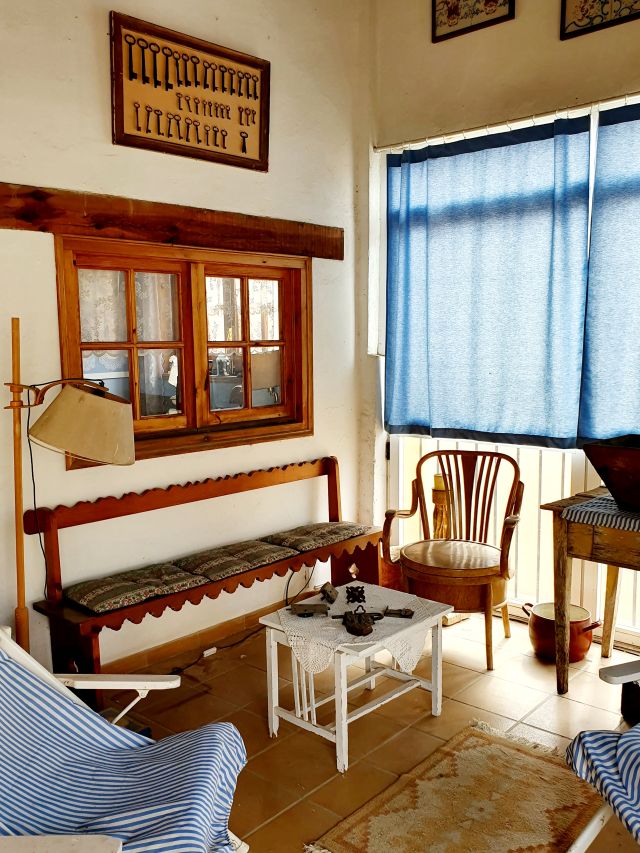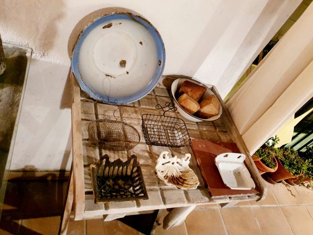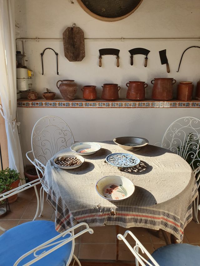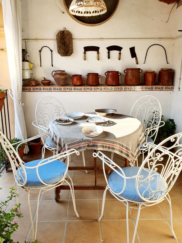 Una taula de fusta que té una bona pila d’anys està acompanyada d’unes cadires de jardí dels anys setanta del segle passat. Damunt la lleixa hi ha una col·lecció de terrisa destinada, prinicipalment, a conserves i tupina.