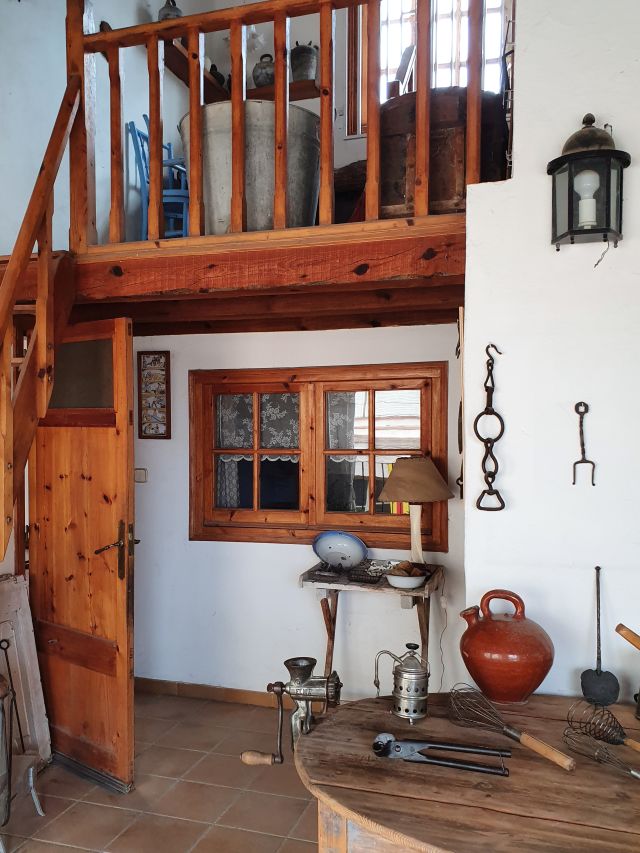 Peces relacionades amb l’elaboració de menjar presideixen aquest racó. A la part superior es pot veure la meitat d’un gran cedàs que es feia servir per passar la farina.