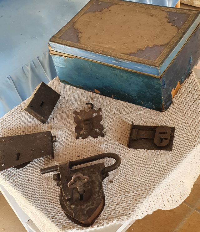 Una caixa de fusta folrada que resulta del tot “vintage” acompanya uns objectes fets amb ferro.