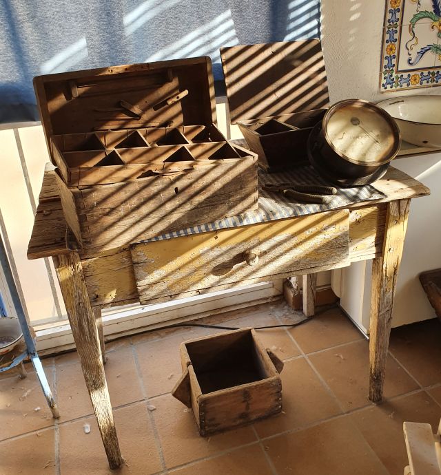 Aquí s’hi veu una vella taula que havia estat en una cuina i espera una mà de restauració, una antiga caixa d’eines que resulta ben original i que també cal restaurar, una mini pastera i un aparell per mesurar la temperatura procedent de la Panificadora del Sindicat de Cervera.