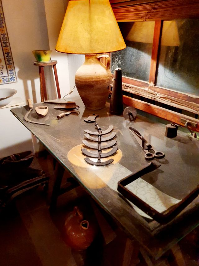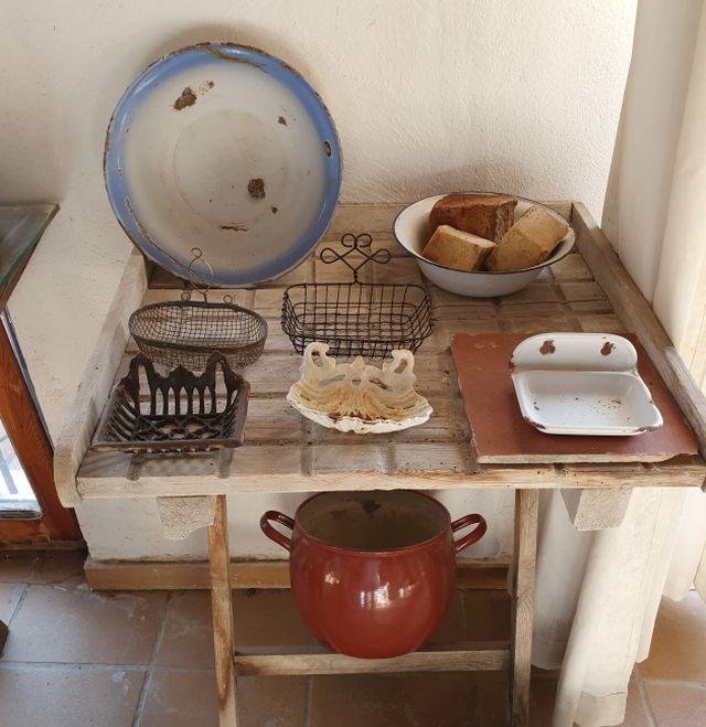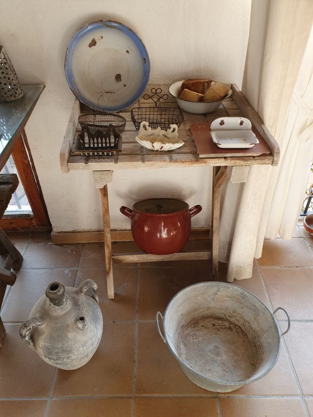 Damunt la taula s’hi veuen uns estalvis de ferro pintat molt curiosos ja que es mouen amb unes petites rodetes que porten a les potes. Els plats, ben antics, estan recoberts amb ceràmica esmaltada.