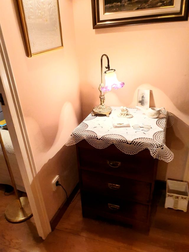 A l’altre racó un moblet de caoba llueix un bonic tapete. El llum té una figura de nen al peu i la pantalla de vidre és d’un color malva poc vist.