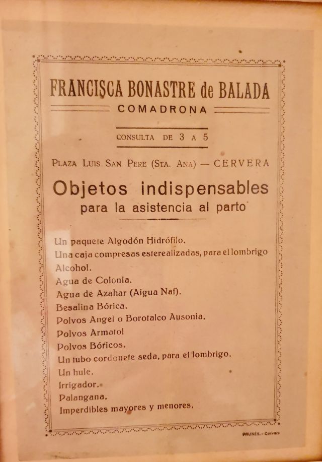 Aquest full emmarcat fa molta gràcia. Aquesta comadrona era la mare de la Sra. Balada, que també fou comadrona i que els de més edat segur que la recorden. És ben curiós llegir el que la família havia de tenir preparat pel naixement d’un infant. No és estrany que, si les coses anaven malament, les parteres s’hi quedessin!